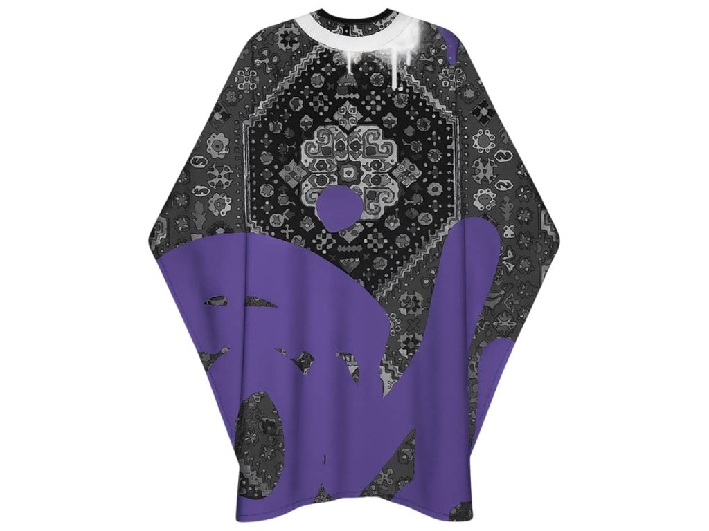Profesionálny barber pláštenka MARMARA BARBER Fly Carpet Purple – vodeodolná, antistatická as elastickým golierom. Štýlový dizajn a maximálny komfort pre zákazníkov aj barberov.