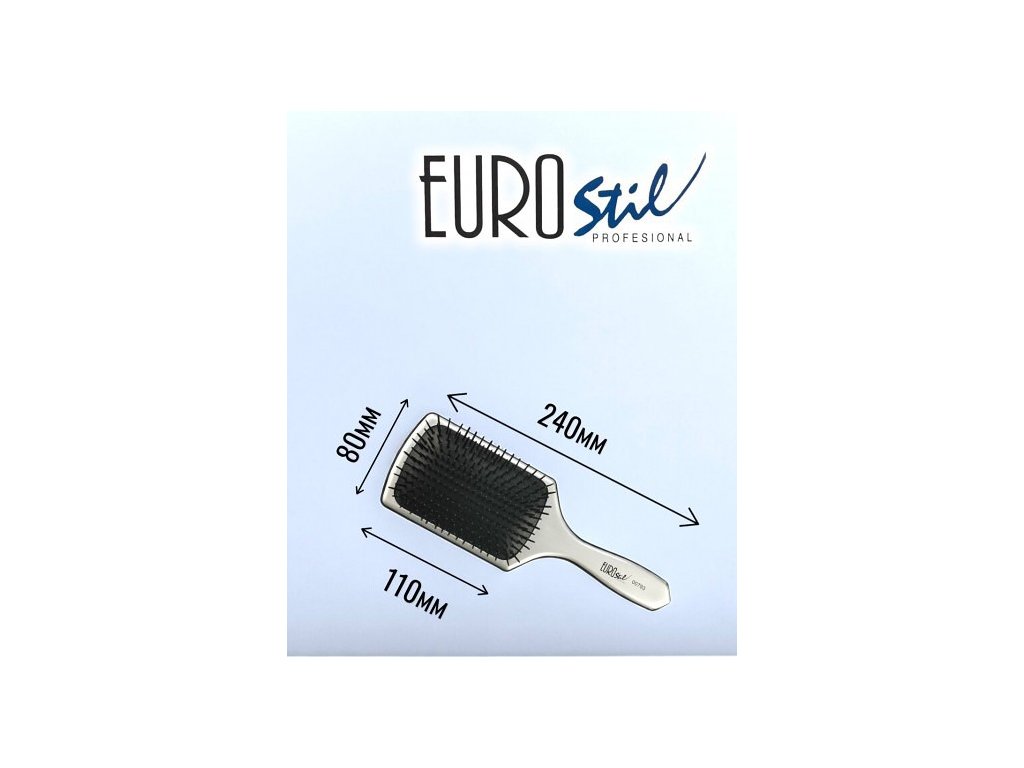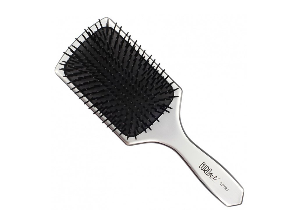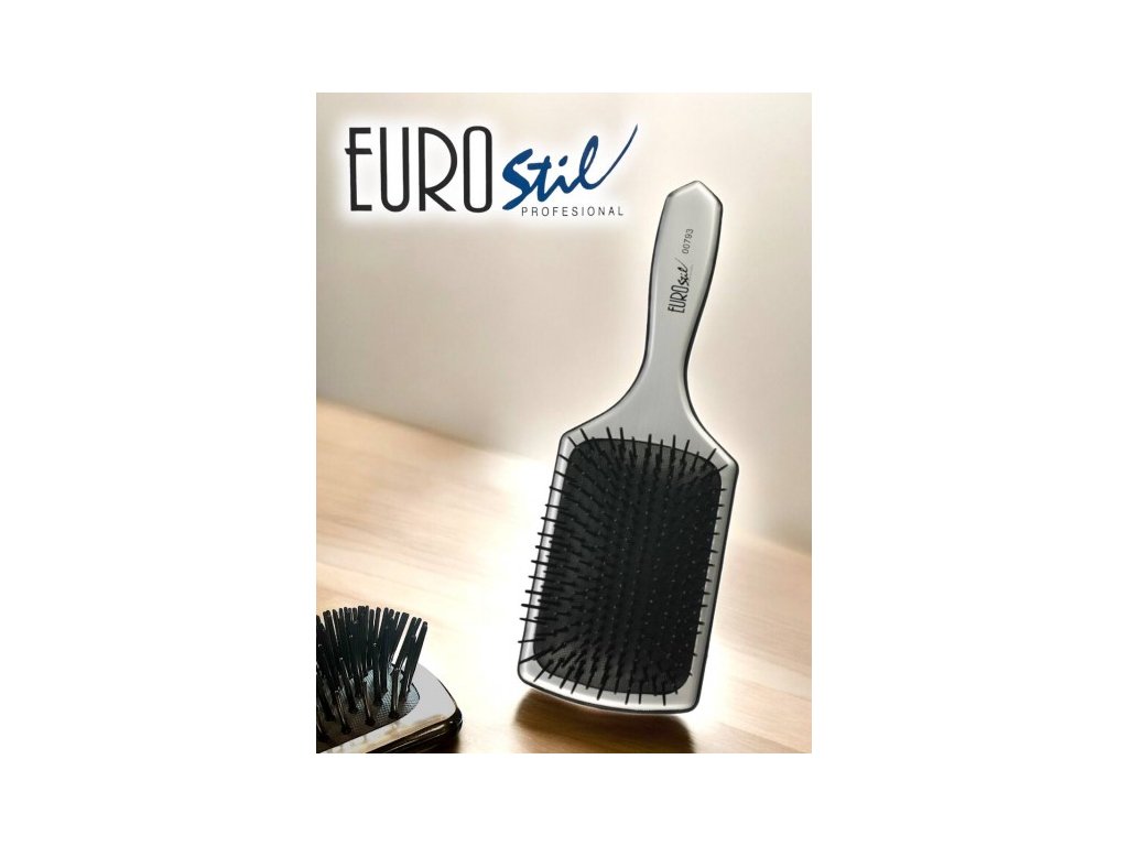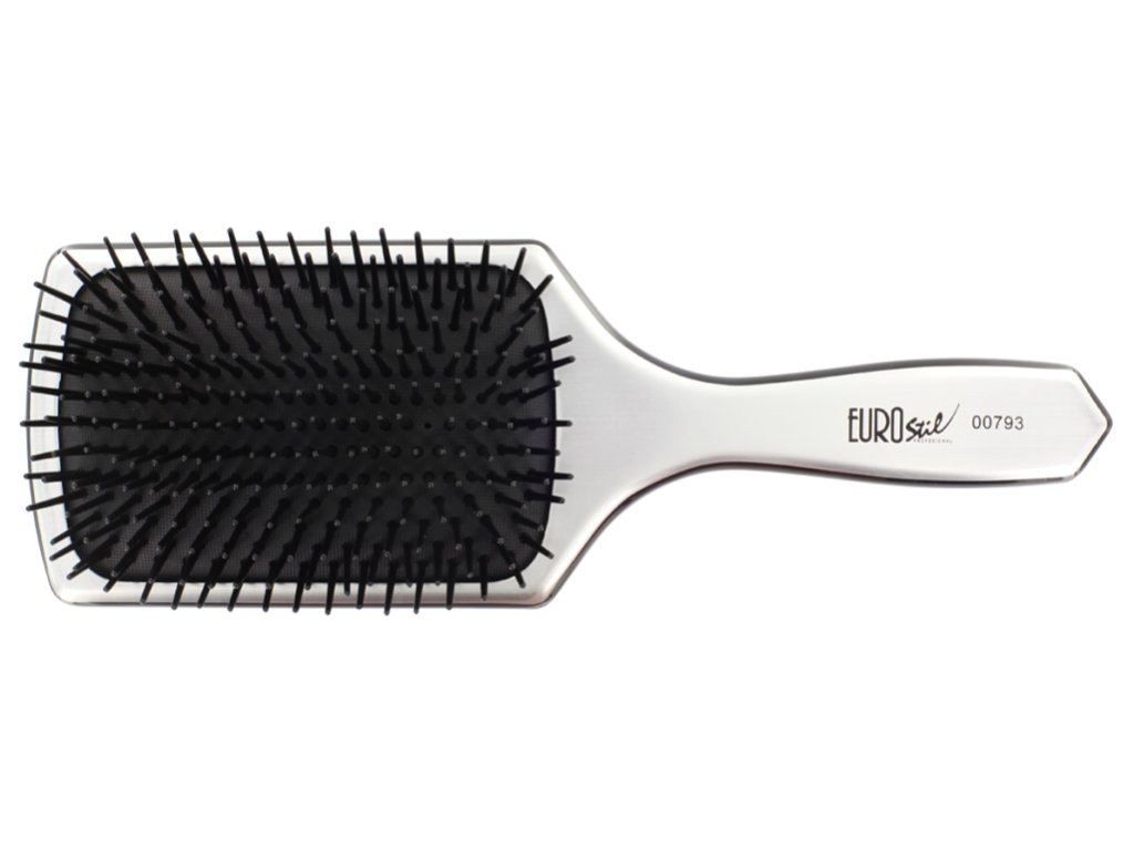 EURO STIL PROFESSIONAL 00793 * Profesionálna plochá rozčesávacia kefa s plastovými štetinami * Telo kefy v elegantnom kovovom dizajne * Štetiny sú vsadené v gumovom vankúši a sú plastové a zaguľatené * Rozmer 80x240mm *