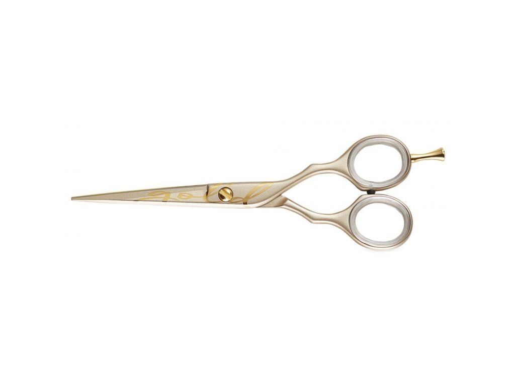 Profesionálne kadernícke nožnice KIEPE 2451 o veľkosti 5,5 palcov (14,5 cm) v luxusnom zlatom dizajne. Vyrobené sú z extrémne tvrdej nerezovej ocele brúsenej technikou "Diamond Sharp" pre jemnú a precíznu prácu.