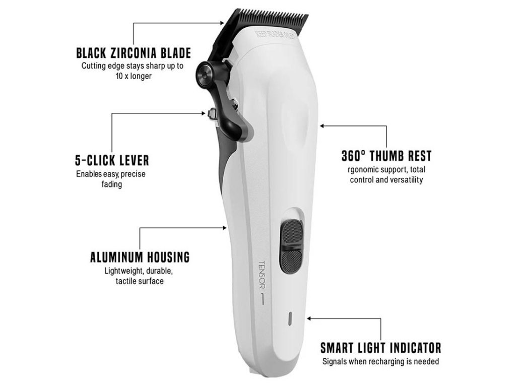 Tensor 1 má MIM čepeľ s DLC+ povlakom – kombináciu diamond-like carbon vrstvy a nano-grafénu, ktorá znižuje trenie takmer na nulu. Integrované olejové zásobníky zaisťujú, že čepeľ je stále správne premazaná, a vďaka čiernej zirkóniovej čepeli vydržia až 10× dlhšie ako bežné kovové nože. Bez ohľadu na typ vlasov – husté, tvrdé alebo kučeravé – Tensor 1 ide hladko a presne.